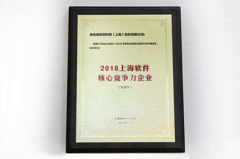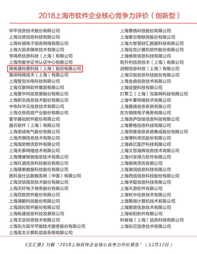 经上海市软件行业协会发布公告并在《文汇报》公示,商客通尚景荣获“2018上海软件核心竞争力企业”荣誉称号,充分肯定了公司在上海市软件行业的重要地位,以及对上海软件产业的突出贡献。